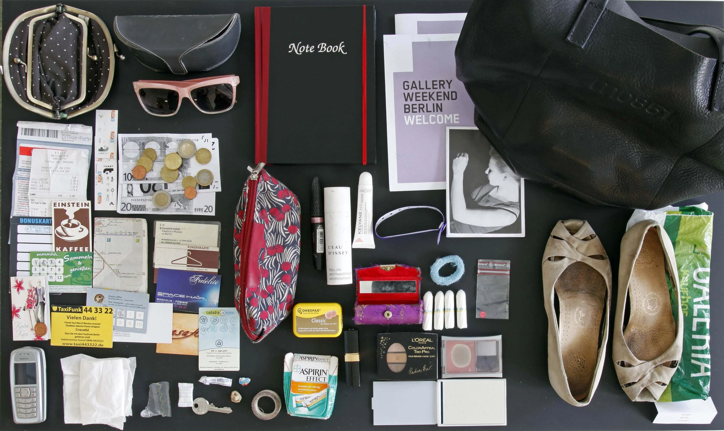 All of the contents were precisely placed in glass vitrines and visitors to the show learned that Susanne, 38, from Berlin, smokes an awful lot of Van Nelle tobacco roll-ups; that Stephanie, 43, from Paris, likes Haribo sweets, and Oriane, 27, from Berlin carries Ohropax classic ear plugs, aspirin, sunglasses, the single button in a plastic bag that you get from new clothes and never use, Issey Miyake deodorant, a city transport map and a well-used pair of flat shoes.